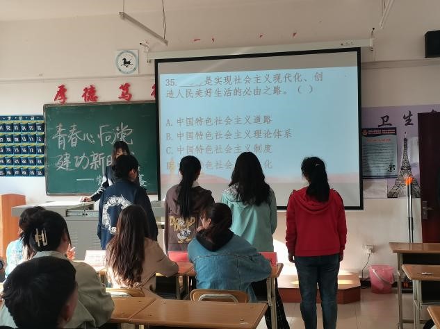 活动伊始,由主持人介绍比赛规则及参赛班级,并请各班级派代表进行抽签决定参赛顺序。接着,比赛正式开始。先是知识问答环节,题目形式以单选题、多选题、判断题的方式呈现。其中四个人负责单选题,两个人负责判断题和多选题,一个人负责回答填空题。为了缓解选手们紧张的比赛氛围,竞赛途中主持人带领大家进行击鼓传花游戏,并邀请同学上台表演太极,为比赛选手加油助威。