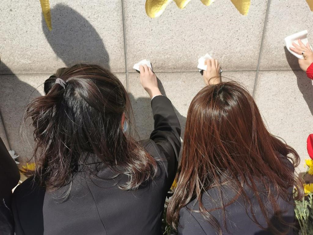 (图为员工代表擦拭纪念碑)
