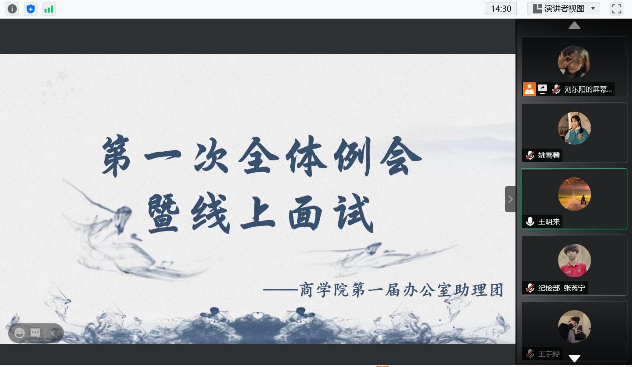 会议伊始,办公室助理团团长王明来对前期问卷中涉及到的所有问题进行分析和解答,并对填写调查问卷的同学进行面试。面试时打开摄像头自我介绍,大部分同学表现的非常积极,对自己进行全面介绍并谈到对日后工作的期望和决心。相比之下,几名同学表现的相对腼腆。通过遴选,最终有125名成员加入助理团。