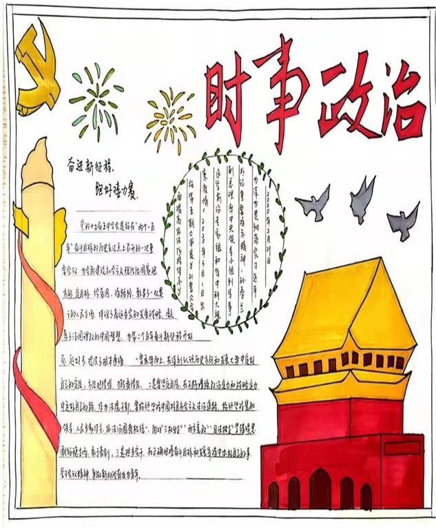 李一希同学以时事政治为主题,就党的十九届五中全会这一背景绘制了一副精美的手抄报作品,在这幅作品中,绘有和平鸽,橄榄枝,党徽,天安门等在新中国历史上具有标志性的事物,并在文章中对习近平总书记的思想进行了阐述,无一不在表达着她对新中国的热爱。