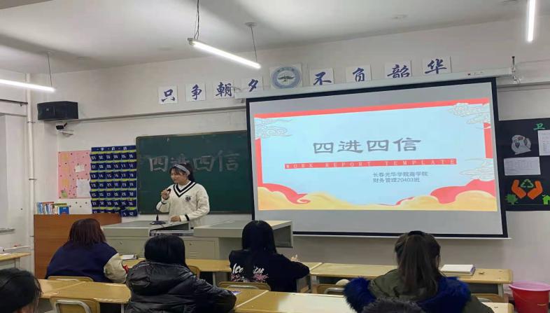 主持人从“四进”入手,分条为同学们进行讲解。主要从重要精神内容、“四进四信”的内涵、提出背景及其重要意义四个方面进行详细的介绍,为班上同学普及了相关知识,同时也为活动第二部分的开展提供了知识背景。最后,本次活动以几位同学分享心得体会告一段落,下面为优秀同学的心得体会。
