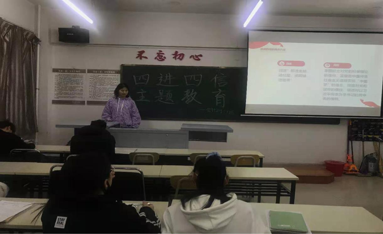 活动伊始主持人点明了此次活动旨在进一步增强对学习宣传贯彻习总书记重要讲话的重要性、必要性、战略性的认识,用“四进四信”引领班级团员青年,构建学习型、服务型、创新型基层团组织。随后主持人向同学们提出是否了解“四进四信”这一问题,引发了同学们对此次活动主题的思考。