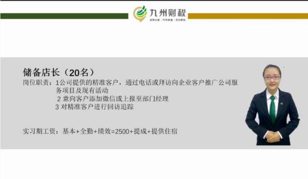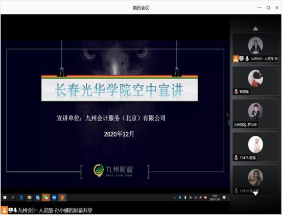会议伊始,九州会计人资部孙小娜经理以短视频“九州辉煌”吸引起各位同学的注意力,并以此简要的介绍了九州会计的历史。其次,孙经理对企业进行了全面的介绍,包含企业的发展史、团队人员、居住环境,以此展现九州会计的规模之大、能力之强。与此同时,孙经理为同学们带来了往届毕业生的视频分享,介绍了工作时所得的报酬和优越的就业环境,吸引各位同学的兴趣。随后,她还介绍了九州会计的福利制度、招聘的岗位和薪酬。其中,招聘储备店长20名、会计助理5名,在实习期间,就可具备诸多福利。会议尾声,孙经理在线上与各位同学进行互动交流,切实增强同学们对九州企业的了解。