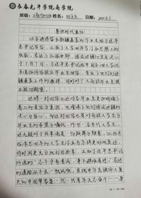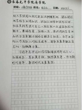 这样一封回信,让这118名毕业生更加明确了肩上的责任与重担,也增添了他们建设边疆的决心与信心。而这份回信也是对高校老员工与毕业生的希望与嘱托。作为一名当代老员工,这对于我来说是一份鼓励与鞭策,让我开始深思四年的老员工活应当怎样的更好渡过时间更充分地利用起来。正如习近平总书记所说的“志不求易者成,事不避难者进。”前进的道路从不会一帆风顺,实现中华民族伟大复兴的中国梦需要一代一代青年矢志奋斗……身处大学校园的我们更应该脚踏实地,稳扎稳打的学好专业课知识,积极主动地参加校内活动、社会实践等,提升自己的人际交往以及社会实践能力,磨砺青春,历练人生,最终将所学的专业知识与自身能力相结合服务于社会,在毕业后的工作岗位上对社会进步,国家发展奉献出自己的一份微薄力量。