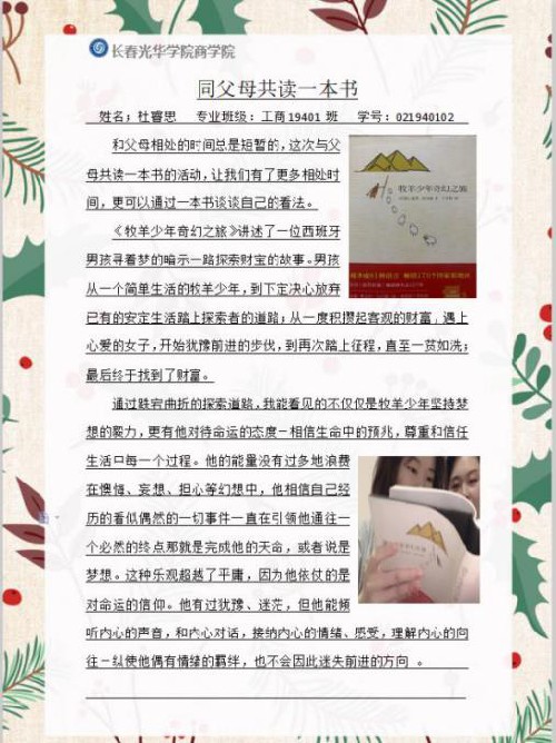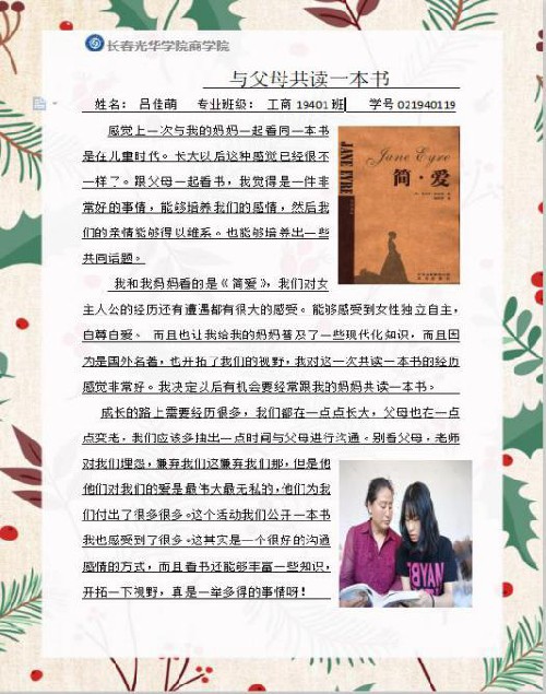 “腹有诗书气自华,读书万卷始通神”,读一本好书就是在提高自己的内在修养与学识,读书多了,眼光就会变得长远,就不会把自己局限在一个狭小的世界,同时与父母共读一本书会使得孩子和父母的关系更加融洽、和谐。下图是工商19401班的两位同学与父母共读的书目以及自己的心得感悟。