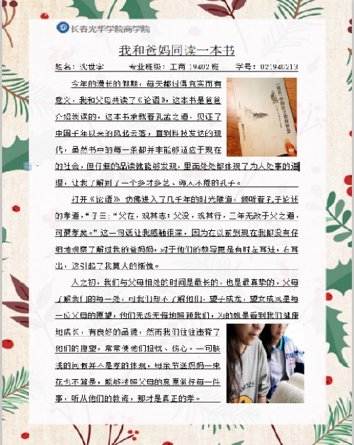 周恩来总理曾说过“为中华崛起而读书”。读书是最好的学习,书籍是任何一种知识的基础,也是一种涵养的体现。而书籍也是沟通感情最好的方式。与父母共读一本书会使得子女和父母的关系更加融洽、和谐。在彼此的陪伴中增进亲情。下图是工商19402班的两位同学与父母共读的书目以及自己的心得体会。