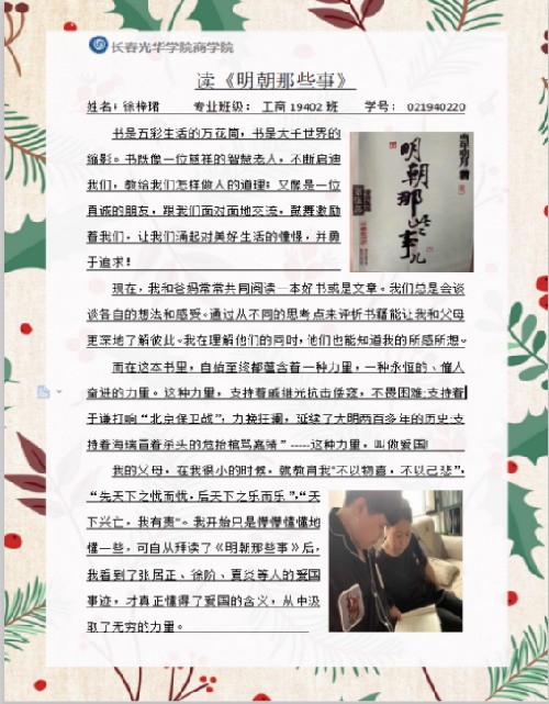 必赢76net线路学习筑梦小组开展“日积月累,以学战疫”英语学习活动暂时告一段落,同学们学习的脚步仍没有停下,趁此疫情期间,我们开展了“与亲同读,与爱同行”活动,本期就让我们来看一看工商19402班两位同学的亲子读书吧!