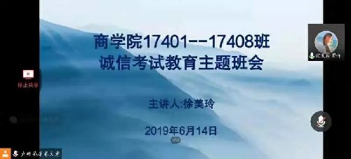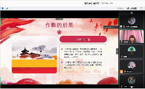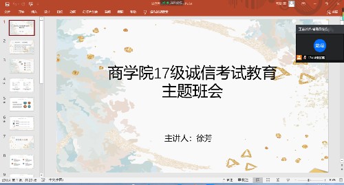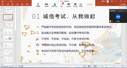2019级辅导员为了让同学更加重视期末复习,懂得诚实守信的重要性,帮助同学们树立正确考试观,积极应对考试,特召开了线上“诚信应考”主题动员大会。李勇老师为同学们详细介绍了线上考试的注意事项并鼓励同学们以平和的心态应对考试。