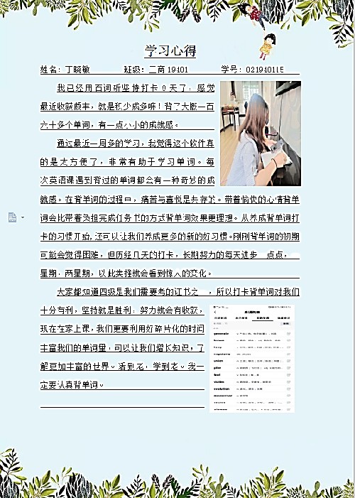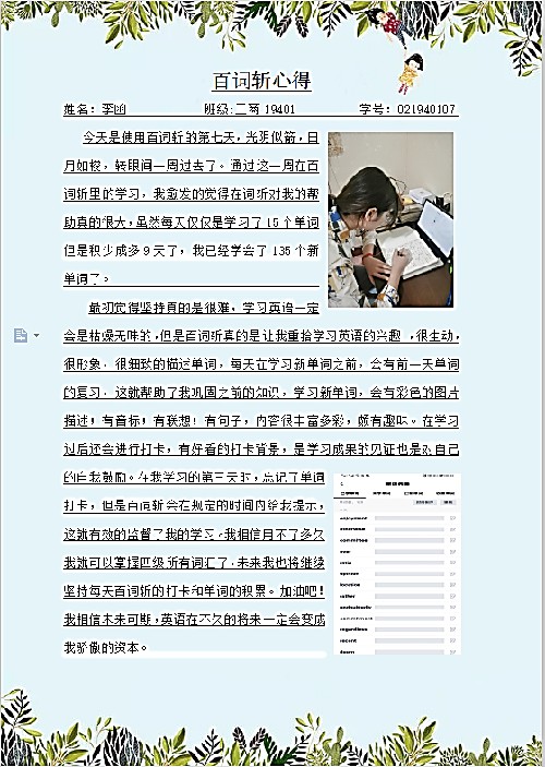 知识文化水平的提升在于平时的点滴积累,必赢76net线路学习筑梦小组采取朋辈互助的形式,以相互监督的机制激励同学们自主学习英语,所谓慢工出细活,在自主学习英语的过程中磨炼耐心和增强信心,我们一起来看看同学们的学习成果吧!