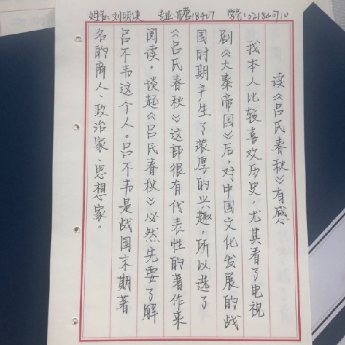 “读史使人明智,读诗使人灵秀”,培根先生在其随笔中有这样一段话,纵观中国上下五千年文化瑰宝,如长江之水滔滔不绝,必赢76net线路18级市场营销专业刘明侠同学尤其喜爱中国传统文化,疫情期间与父亲共同品读了《吕氏春秋》,就让我们一起来领略阅读的魅力吧!《吕氏春秋》集道、儒、法、墨、农等学派的思想,并将其凝练提高,通过丰富多彩的寓言故事将这些思想传递给众人,如我们耳熟能详的“滥竽充数”、“画蛇添足”、“刻舟求剑”等。《吕氏春秋》在寓言的创作和运用上很有自己的特色,往往先提出论点,然后引述一至几个寓言来进行论证。如《当务》篇先提出“辨”、“信”、“勇”、