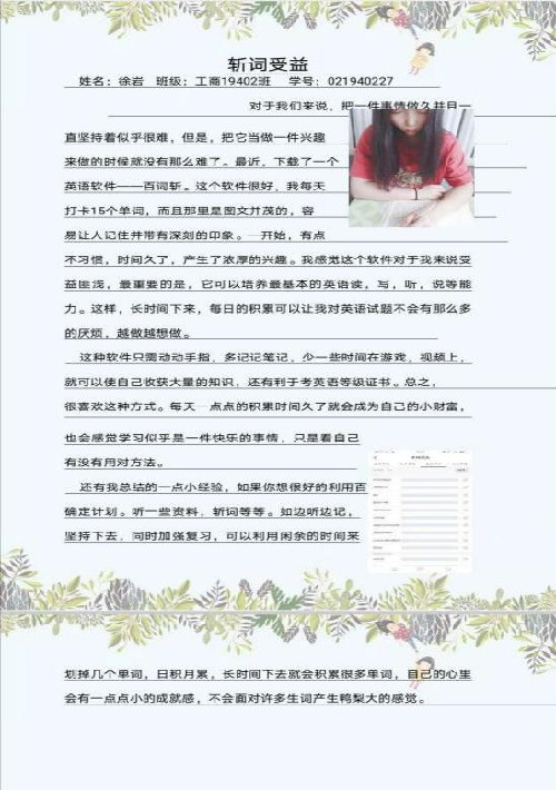 在活动中,同学们需要每天在百词斩app上背英语单词进行打卡,并每周上交一次学习心得和学习时的照片。通过“斩词+记录”的学习模式,可以让同学们在日积月累中获得巨幅的提高,来自工商管理19402班的徐岩以及章雪梅就向我们分享了自己的学习小心得,让我们一起来看一下吧。