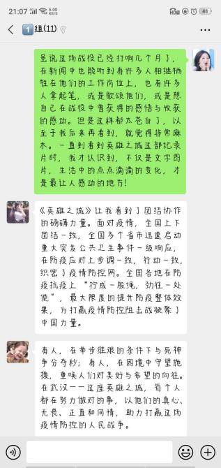 观影结束后,同学们纷纷在群中交流感受,深刻感受到这场抗疫战争中武汉人民做出了巨大努力,疫情防控一线的逆行者做出了很大贡献,向每一位战疫英雄致敬,没有他们义无反顾的奋战,就不会有如今的静待花开。同学们将在日后的学习生活中更加努力奋斗,做一个有理想、有责任、有担当的新时代青年。