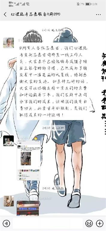 1月27日大年初三,在吉青社工作人员的指导下,接受了专门培训,终于开始了她的线上心理疏导志愿服务,每天早八点至晚十点不间断的在网上收集人们对于本次疫情的疑问,尤其是心理问题,整理罗列成条之后由心理专业的老师进行解答和疏导。同时,在心理老师的指导下发表一些关于面对疫情如何心理疏导的文章到朋友圈或微信群,尽自己所能减少民众的恐慌。再过几天还有机会参加线下任务,例如去医院协助测温,疏导就诊民众的焦虑情绪以及接听心理咨询热线电话。她希望疫情早日被战胜,武汉加油,中国加油。