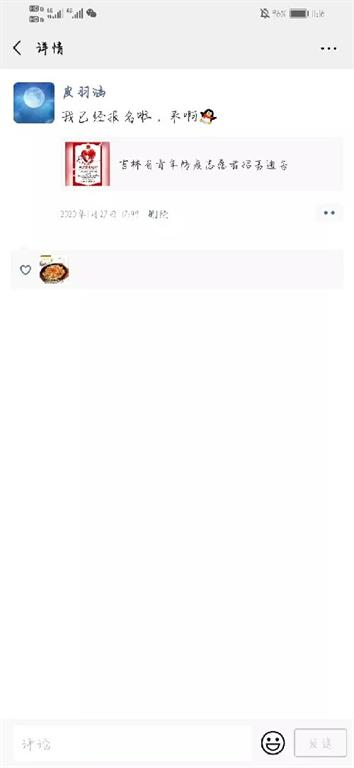 当她从网上得知武汉疫情防控的形势非常严峻,虽然人已经在吉林省公主岭的家里,但一向乐于助人的她第一个念头就是马上报名参加援助武汉的志愿工作,但最后由于武汉封城,官方不再招募外省人员未能如愿。于是她又多渠道打听还有什么事能尽她的微薄之力,当看到吉林省青年防疫志愿者招募通知心里分外激动。