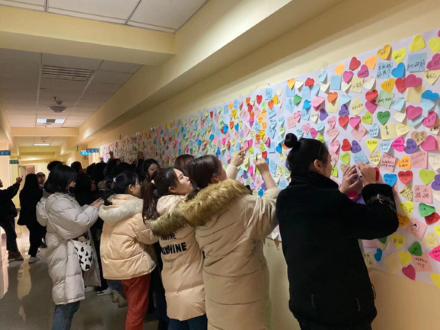 两个小组成员到达医院后,小组成员们在医院的四楼大厅坐好并开始表演为患者们准备的文艺节目,大家共同合唱《感恩的心》,《夜空中最亮的星》等歌曲,紧接着,小组各成员及医院患者在大厅中央共同跟随着音乐齐舞。文艺节目后,小组成员们将带来的卡纸下发给患者们并耐心地教患者们如何叠成手工作品,并将手工作品送给患者们留作纪念。患者们午餐时间,小组成员们参观了医院的二楼治疗区和手工区,看到了患者们在墙上的留言,随后小组成员也留下了暖心的话语在手工区的墙上鼓励患者们,最后小组负责人刘悦对此次活动进行了总结。
