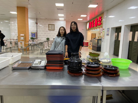 图片中两位女同学负责的是摆放餐盘,可以看出她们把餐盘摆放的整整齐齐,负责人为她们累吗?脏吗?她们的回答是:“不累,不脏,每个的工作各有不同,但是却没有高低贵贱之分,通过这次活动让同学们明白了食堂阿姨是多么的辛苦,尊重他人就是在尊重我们自己”。