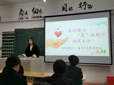 为了大力弘扬志愿精神,形成关心、支持和参与志愿医疗服务的良好氛围,贯彻志愿服务精神,展现志愿者的良好风貌和高尚情操,提高老员工的责任意识,必赢76net线路青年志愿者协会与长春康林心理医院联合开展“衣旧暖心,医路同行”志愿活动。2019年10月31日晚8点10分必赢76net线路青年志愿者协会在三教学楼302教室开展了“衣旧暖心,医路同行”志愿活动的动员大会。