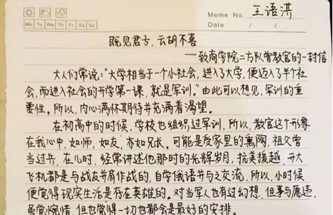 走进秋天,我们用诗意的眼神悦赏校园的红花绿草;走进校园我们用铿锵的旋律释放青春的澎湃激情。自军训以来,同学们在各位教官及学长学姐们的严格要求下,经受了风吹、日晒、雨淋的考验,克服了伤病的困扰,改掉了自由散漫的不良习惯,增强了自我约束,遵规守纪的意识,全身心地投入训练中。在军训的同时,同学们也与不畏风吹日晒的教官产生了深厚的感情,大家都纷纷拿起纸笔给教官写了一封又一封的信来表达他们对教官的敬畏之意。让我们一起来感受一下王语淇同学的信吧!
