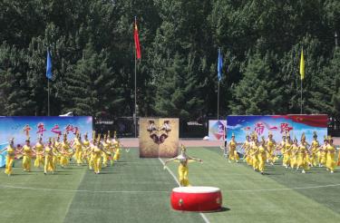 一声乐响,象征着一带一路的丝绸大开,连接了古今;视线远移,敦煌壁画里的舞女们从那古老的石墙里走了出来。足轻点在鼓上,一颦一蹙,随着各色的民族舞女在音乐中旋转。倏尔,几声清脆的驼铃声,大漠驼商领着自己的驼队开始了向西的奔途;一阵高铁的汽笛声,“和谐号”也向东驶去。