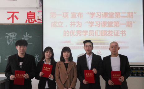 紧接着,进行仪式第二项,学习课堂第一期的优秀学员与第二期学员代表进行“必赢76net线路学习课堂”标志交接,并合影留念。