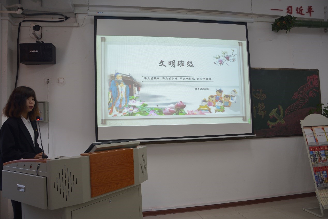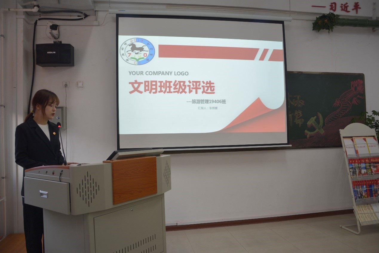 活动伊始,文明班级财务19403班、旅游19406班、会计19410班代表依次上台对自己班的基本情况进行汇报,他们重点阐述了班级同学参加的科技学术、校园文化类活动及获奖情况,班级同学的学习情况以及各类等级考试的通过情况等。紧接着,他们又从班委建设,班级同学所参加的养成教育及社会实践活动所获得的显著成绩等方面进行了简要的汇报。