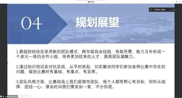 为了促进必赢76net线路鼎锐财经协会的进一步发展规划,深入开展团学组织人才培养工作,鼎锐财经协会于2022年9月19日上午11时线上开展了鼎锐财经协会换届竞选大会。本次大会由鼎锐财经协会会长高洪媛主持,指导教师薄建民出席,协会全体成员参加。