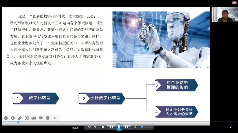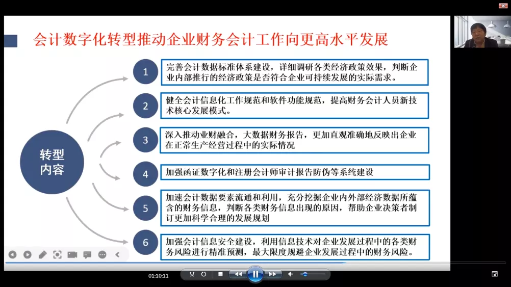 在会计数字化转型部分,李晟璐教授在对会计学、财务管理理论基础进行简单介绍后,跟大家分享了数字化经济是如何促使企业会计数字化转型的,并详细讲解了会计数字化转型的各界认可,对会计数字化转型的内容进行了简要介绍。