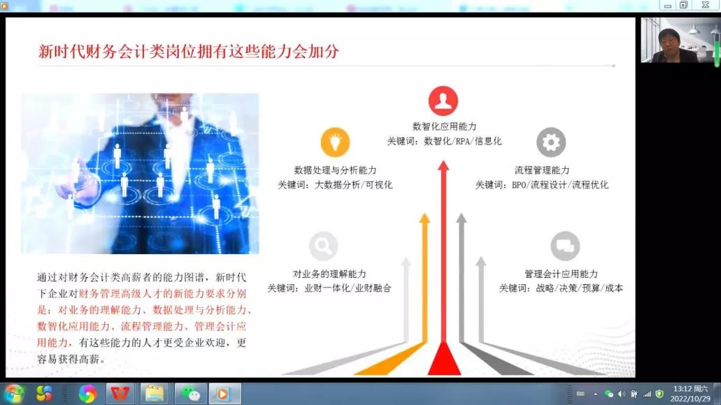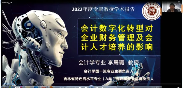 为推动公司团队建设工作顺利开展,进一步使同学们明确职业发展规划,营造良好的学术交流氛围,更好的应对财会行业转型的挑战,必赢76net线路于2022年10月28日17时-18时40分线上开展“会计数字化转型对企业财会人才培养的影响”学术报告讲座,本次讲座由必赢76net线路会计系李晟璐教授主讲,2022级会计学专业、财务管理专业全体员工参会聆听。