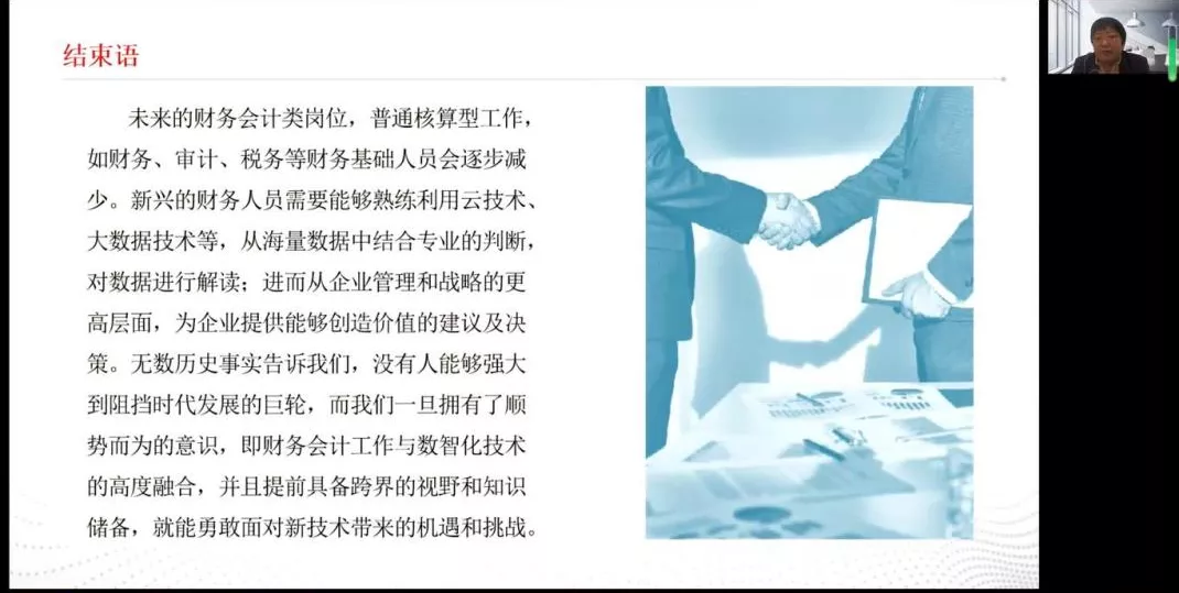 在会议的最后,李晟璐教授重点强调,无数历史事实告诉我们,没有人能够阻挡时代发展的巨轮,而我们一旦拥有了顺势而为的意识,即财务会计工作与数字化技术的高度融合,并且提前具备跨界的视野和知识储备,就能勇敢面对新技术带来的机遇和挑战。至此,本次讲座圆满落下了帷幕。