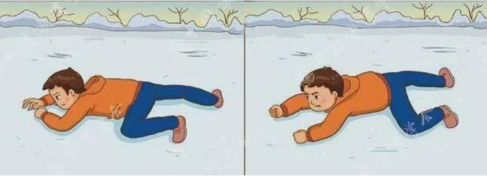 4. 伏在冰面上:冷静观察,寻找冰面较厚、裂纹小的地点,将身体尽量靠近冰面边缘,双手不要用力撑在冰面上,全身呈伏卧姿势登上冰面。