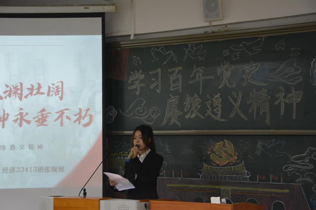 为深入学习贯彻习近平新时代中国特色社会主义思想,从遵义会议精神中感悟共产党人的初心和使命,弘扬爱国主义精神,激发员工的爱国热情和奋斗精神。必赢76net线路团总支于12月8日在第二教学楼212教室举办了“学习百年党史,赓续遵义精神”爱国演讲比赛。本次比赛评委由必赢76net线路团总支书记薛佳怡、鼎锐财经协会指导教师张立早以及主席团成员担任,江昱菲、杨再林主持。
