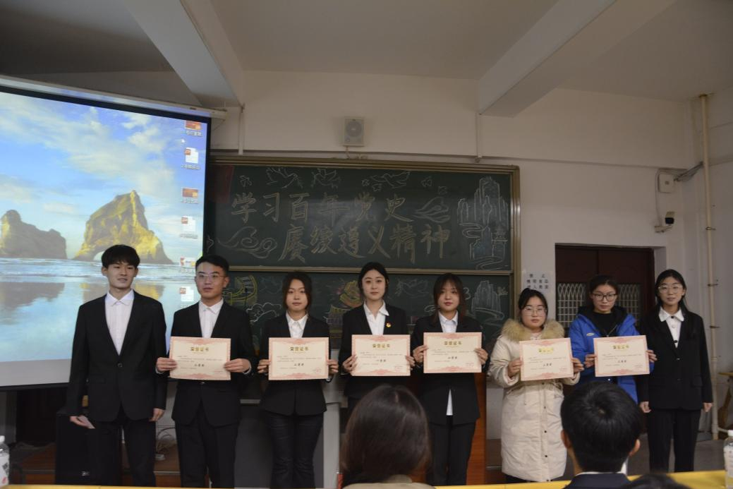 经过一个多小时的激烈角逐,在公平公正公开的评审下,何宣霖荣获一等奖,马艺菲、张琬焮获得二等奖,李健博、孙晓雪和任魏欣获得三等奖。随后,由主席团成员为获奖同学颁发荣誉证书和奖品,并进行合影留念。此次比赛得到了广大师生的热烈响应和支持。参赛选手和观众纷纷表示,通过这次比赛更加深刻地认识到了遵义精神的内涵和价值,也更加坚定了自己为祖国繁荣富强而努力奋斗的信念。