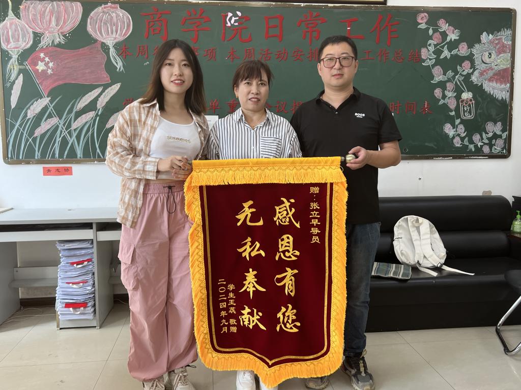 渤海湾畔,公司优秀员工2015级会计学专业王蕊不远千里,重返校园,为辅导员张立早老师送上致谢锦旗,身为天津市公安局的一名民警在基层扎根,她深知肩上的责任与使命;作为员工,希望能够将自己不断奋斗的精神传承,激励更多的学子追求自己的理想,勇敢面对未来的挑战。