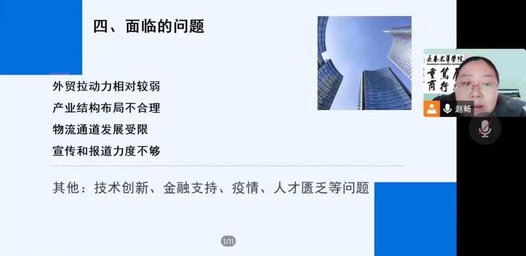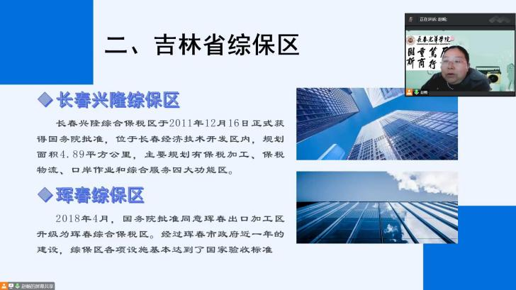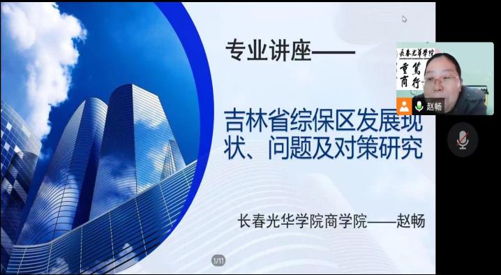 报告开始前,赵畅老师通过在线视频的方式向同学们展示了实验楼内国际经济与贸易的专业实验室,并讲解了未来的学习方向与专业实训情况。随后,报告会正式开始,赵畅老师就国际经济与贸易专业的科学研究内容,向同学们讲解了吉林省综保区的情况。赵畅老师从全省到全局,向同学们生动展示了建设吉林省综保区的意义,以长春兴隆综保区、珲春综保区为例,介绍了吉林省综保区在各领域的发展现状以及当前面临的外贸拉动力相对较弱、产业结构布局不合理、宣传和报道力道不够、疫情与人才匮乏等问题。同时提出了有关综合市场、发展物流通道、创新与研发的有关对策。