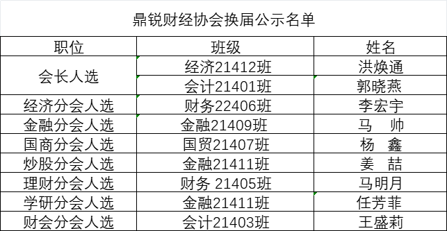 恭喜以上同学成为新一届鼎锐财经协会负责人,希望鼎锐财经协会在各位新任负责人的带领下不断进步,繁荣发展,再谱新篇章。
