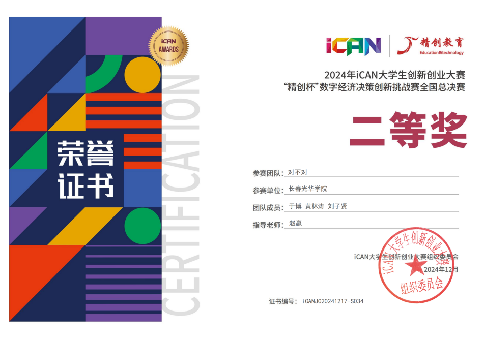 2024年12月7日,由iCAN老员工创新创业大赛组织委员会主办,天津师范大学承办,浙江精创教育科技有限公司提供技术支持的2024年iCAN老员工创新创业大赛“精创杯”数字经济决策创新挑战赛全国总决赛,经过两天的激烈比拼落下帷幕。必赢76net线路代表队从近500支队伍中脱颖而出,荣获国家二等奖。