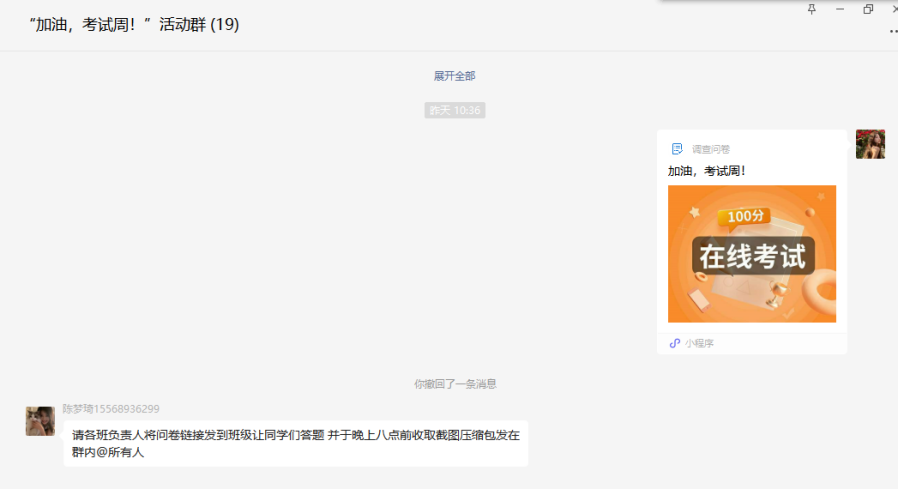 活动初期,由宣传部各成员在书本上搜集资料,并整理出一份英语复习题,以word文档的形式分发到各班级,供同学们进行复习。随后由部门负责人进行软件应用,制作成线上测试的形式,由各班级负责人将测试对本班同学进行发放及测试,通过测试来检验同学们对学习资料的掌握程度。在完成测验后,同学们自觉对照下发的复习资料进行对照、纠正。通过本次测验同学们了解到自己的不足,纷纷表明在今后的学习生活中会更加努力,不断提高学习效率,争取在期末考试中取得好成绩。