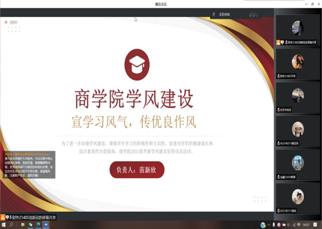 会议伊始,此次活动主持人苗新欣为同学们介绍了学风建设的意义以及学校对学风建设的具体要求。活动第一项:学风宣讲比赛正式拉开序幕,主持人为大家介绍参加学风宣讲比赛同学的基本信息、比赛赛制以及线上抽签决定上场顺序,活动中学风宣讲员逐一进行学风主题的演讲,他们以自己的视角讲述了对学风建设的认知并畅想了学风建设的蓝图,可以说演讲过程十分精彩,观众席的同学们通过公屏为她们点赞、加油鼓劲。